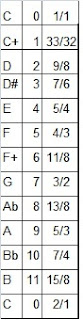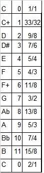 Today’s entry is the start of a piece on a tuning that I used to use on one of my finger pianos. It’s a subset of the tonality diamond, just 12 notes per octave. Here’s a picture of the tuning, based on the overtones of C and F.