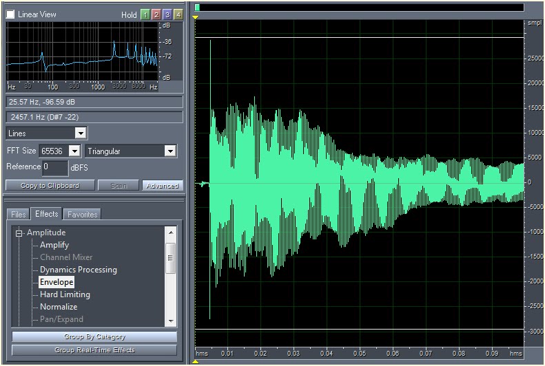 On the CoolEdit screen you can see the waveform of the string in green on the right. This is the first part of a sample at D#7 22 cents flat. That’s a very high note. I try to edit out any silence from the start of the note so that the attack happens when I expect it. Csound adjusts the pitch by moving it up 22 cents during sound generation.