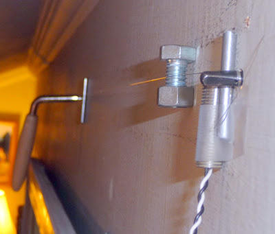Here’s a picture of the bench I used to make the long string samples. The longest is about 18 feet long, and the shortest just a few inches for the very high notes. The location is a wall in my office made of a glulam beam composed of six four by sixes laminated together. It’s very solid and helps the samples sustain so long (up to 20 seconds for the long ones.) The less the instrument vibrates, the longer the sustain.