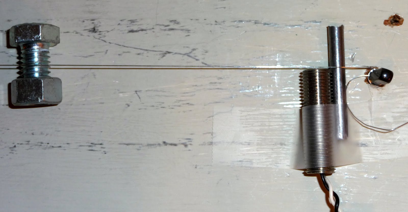 On the far right is the zither tuning pin (from Bart Hopkin’s Experimental Musical Instruments online store.) Then a small metal rod as the bridge on one end, and next the magnetic transducer. Notice how close to the bridge it’s located. This gives the strings more of a harpsichord sound than guitar. The left end of the picture is the movable bridge. In this picture it’s a very short string, making a very high note. The longest ones are around 15′. Notice also the rugged method which which the transducer is mounted: scotch tape. It only has to last a few minutes while I record the samples.