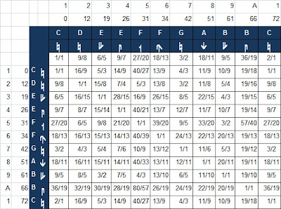 The 3rd notes is a very pleasant 6:5 minor above the root, and the 7th step is a 3:2 above the root. With the addition of the 27/20 (F), we have a very nice major chord on the 8th note (Bb) with the 2nd note (D) at 5:4 above the 9th, and the 5th note (F), a 3:2 above the 8th note. So this mode has a major chord and a minor chord. All very sweet and restful. Things get more challenging with other modes. I stay in each mode for about a minute or two, then move up to the next one.