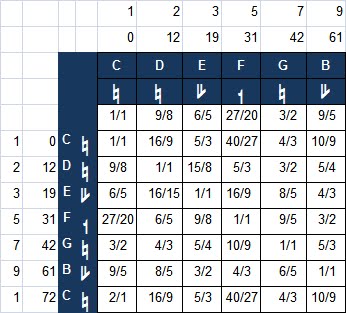 The 3rd notes is a very pleasant 6:5 minor above the root, and the 7th step is a 3:2 above the root. With the addition of the 27/20 (F), we have a very nice major chord on the 8th note (Bb) with the 2nd note (D) at 5:4 above the 9th, and the 5th note (F), a 3:2 above the 8th note. So this mode has a major chord and a minor chord. All very sweet and restful. Things get more challenging with other modes. I stay in each mode for about a minute or two, then move up to the next one.